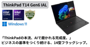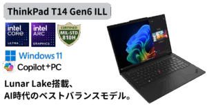 | T14s | T14s Gen6 ILL | ¥200,134〜 | 512 GB→1 TB SSDアップグレード実質無料 | 2025 | 14型 | 約1.3kg | Core Ultra 200V |