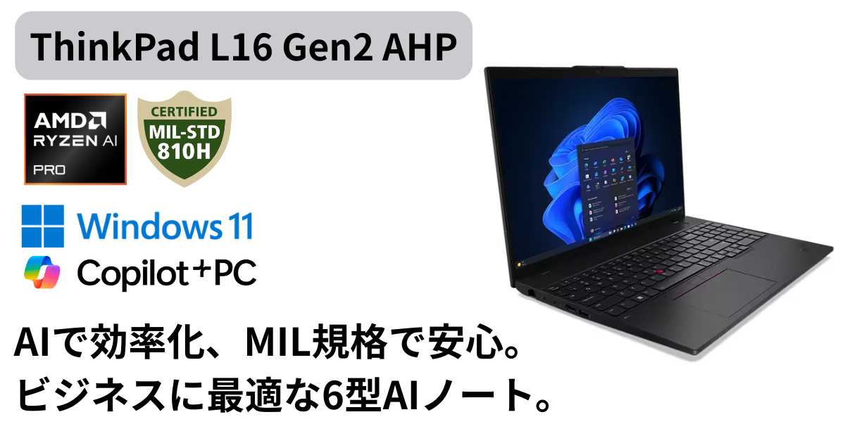 ThinkPad L16 Gen 2 AHP は、広い16型WUXGAディスプレイとテンキー付きキーボード、そして最新の AMD Ryzen™ PRO/Ryzen™ AI PRO プロセッサーを搭載した “AI対応16型ビジネスノート” です。