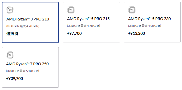 | CPU | AMD Ryzen™ PRO ・Ryzen 3 PRO 210 ・Ryzen 5 PRO 215 / 230 ・Ryzen 7 PRO 250 Ryzen™ AI PRO (Copilot+ PC対応) ・Ryzen AI 5 PRO 340 ・Ryzen AI 7 PRO 350 |