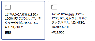 | ディスプレイ | ・16型 WUXGA(1920×1200)IPS/400nit/非光沢(非タッチ) ・16型 WUXGA(1920×1200)IPS/400nit/タッチ対応 |