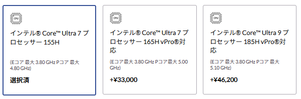 | CPU | IIntel Core Ultra Hシリーズ Ultra 5 135H Ultra 7 155H / 165H Ultra 9 185H |