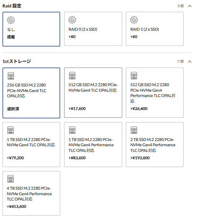 | 256GB(Gen4) | NVMe TLC | OS+アプリでほぼ満杯。WS用途では非推奨。 |