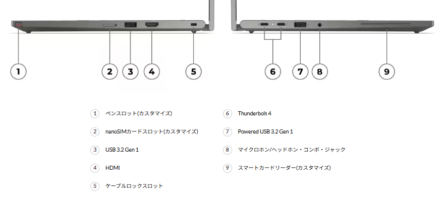 インターフェース | USB-C(Thunderbolt 4 / USB4) ×2、USB-A 3.2 Gen1 ×2(うち 1 ポートは Powered)、HDMI 2.1、マイク/ヘッドホン・コンボジャック、オプションで nanoSIM / スマートカードリーダー |