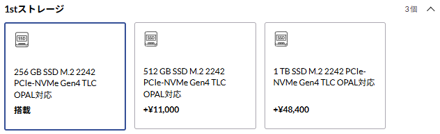 ストレージ | 256GB / 512GB / 1TB SSD (PCIe Gen4 NVMe) |
