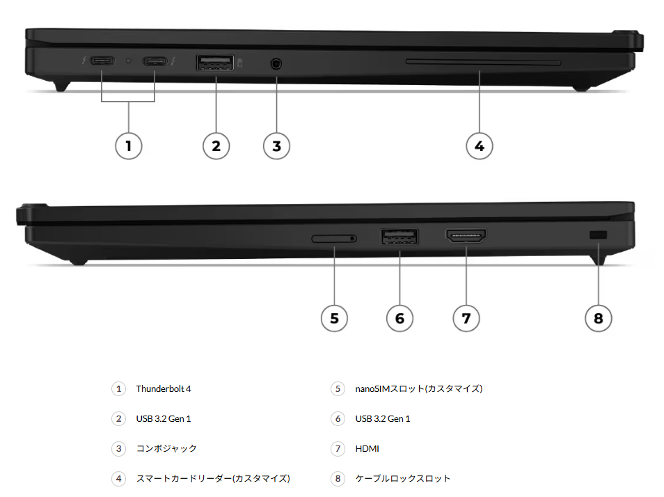 インターフェース | – USB4(Thunderbolt™ 4互換、最大40Gbps)×2– USB 3.2 Gen1(Powered USB)×1– USB 3.2 Gen1 ×1– HDMI 2.1出力– マイク/ヘッドホン・コンボジャック(3.5mm)– nanoSIMスロット(LTE構成時) |