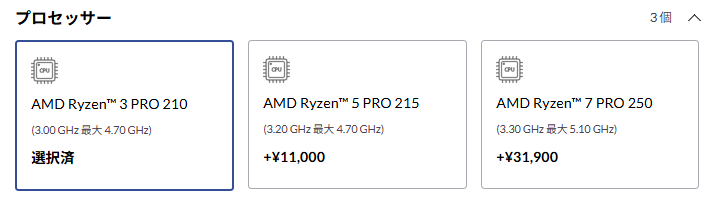 プロセッサー* | – AMD Ryzen™ 7 PRO 250(Ryzen AI対応)– AMD Ryzen™ 5 PRO 215– AMD Ryzen™ 3 PRO 210 |