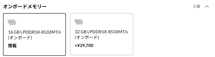 メモリ | 16GB/32GB LPDDR5x (オンボード、交換不可) |