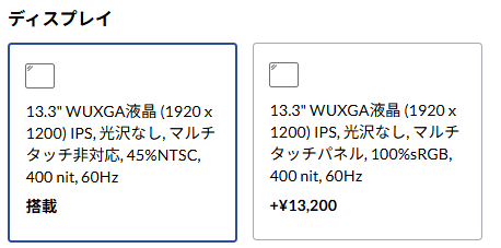 ディスプレイ | 13.3型 WUXGA(1920×1200)IPS (タッチ対応あり) |