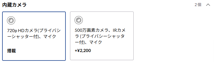 500万画素+IRカメラ | 高精細5MP画質+赤外線(IR)対応。Windows Hello顔認証対応でログインもワンタッチ。 | 在宅勤務・外出先などセキュリティ重視の利用に最適。画質もより自然で明るい印象。 |