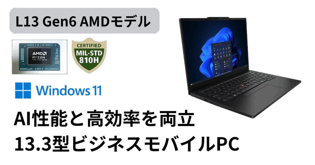 ThinkPad L13 Gen 6(AMD)は、最新のRyzen 200シリーズPROプロセッサーを搭載し、AI処理にも対応したビジネスモバイルPCです。