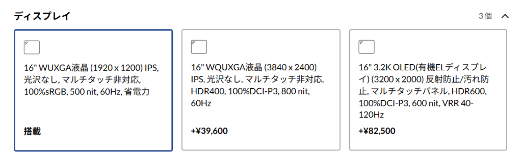 ディスプレイ16型 WUXGA IPS(1920×1200/500nit/省電力)16型 WQUXGA IPS(3840×2400/800nit)16型 3.2K OLED(3200×2000/600nit/タッチ対応)