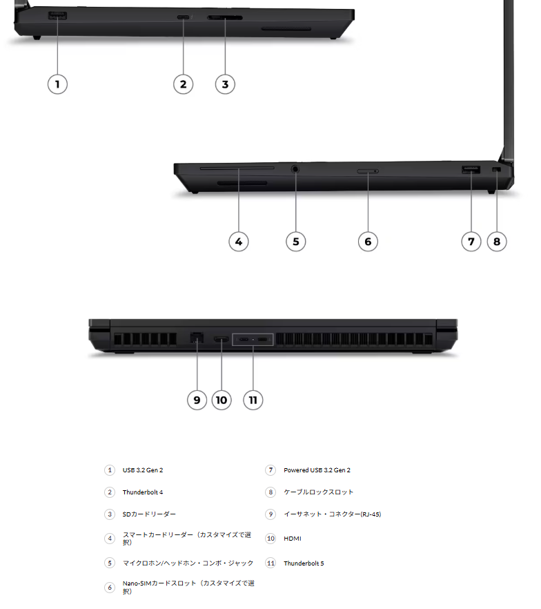 ThinkPad P16 Gen 3は、Thunderbolt™ 5×2+Thunderbolt™ 4×1+HDMI® 2.1を標準装備し、本体含め最大5画面の独立出力に対応します。8K/60Hzや4K/240Hz級の高解像・高リフレッシュ表示も可能で、編集・解析・プレゼンまで柔軟に拡張できます。