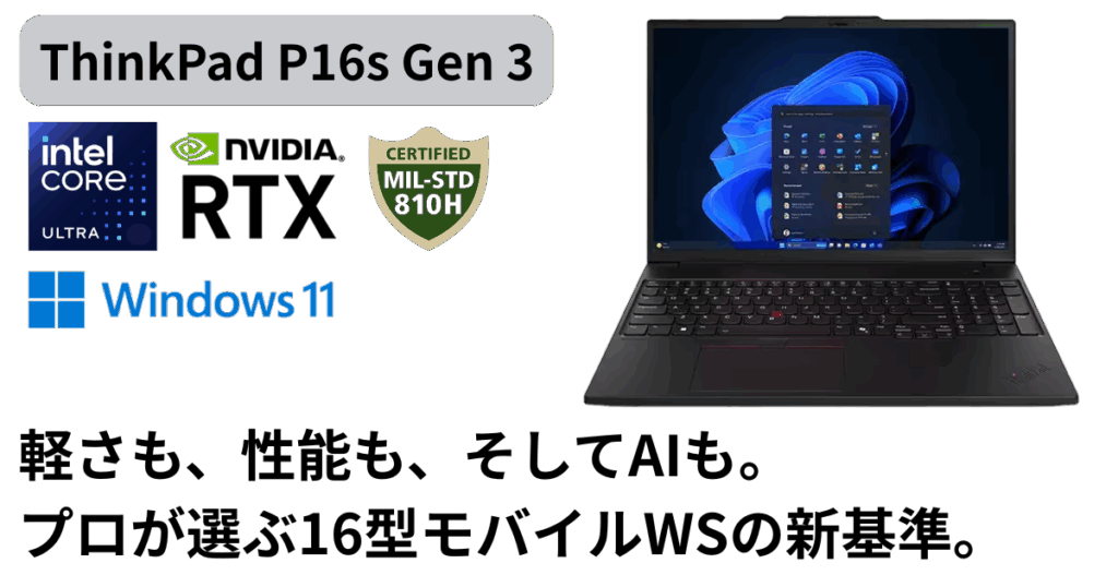 ThinkPad P16s Gen 3 は、最新の Intel Core Ultra(Arrow Lake) と 最大96GBメモリ、Gen4 SSD を備えた、非常にバランスの良いモバイルワークステーションです。