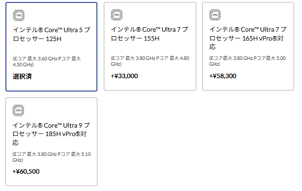 | CPU | Intel® Core™ Ultra(Hシリーズ) Core Ultra 5 125H/135H Core Ultra 7 155H/165H Core Ultra 9 185H |