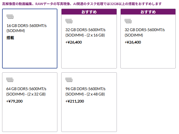 | 96GB(最大) | 大規模CADデータ、BIMの重いファイル、動画編集4K案件、AIモデルの推論・学習など、プロ向けの最高構成。 |