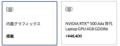 | グラフィックス | – Intel® Arc™ グラフィックス(内蔵) – NVIDIA® RTX™ 500 Ada(4GB GDDR6) |