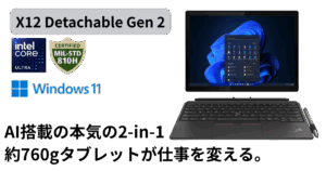 さらに、実務で定評のあるThinkPadキーボードやテンキー、MIL-STD-810H準拠の堅牢性、Wi-Fi 6E/4G LTE対応など、ビジネス現場で求められる機能を多数搭載。