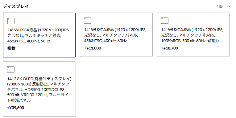 ディスプレイ– 14.0型 2.8K OLED(2880×1800)、マルチタッチ対応、ブルーライト軽減- 14.0型 WUXGA IPS液晶(1920×1200)、省電力/ブルーライト軽減- 14.0型 WUXGA IPS液晶 Privacy Guardモデルあり- 14.0型 WUXGA IPS液晶 DBEF5(高輝度・省電力)モデルあり