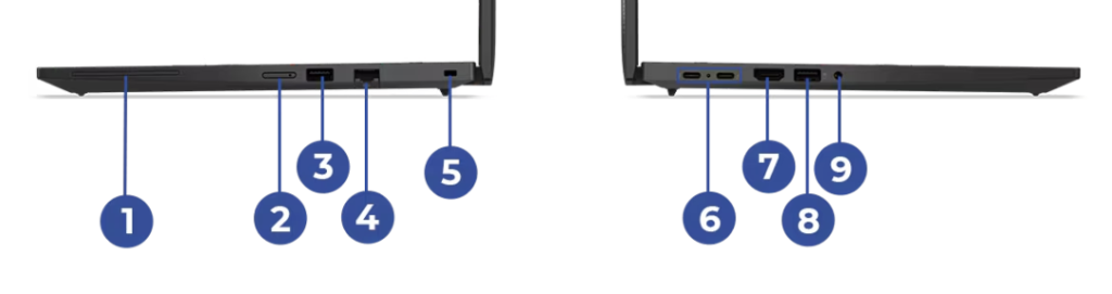 ThinkPad T14 Gen6 IAL は、ビジネスに必要な主要ポートをしっかり装備。モバイル利用を前提に、外部ディスプレイ接続・周辺機器・急速充電まで幅広く対応します。