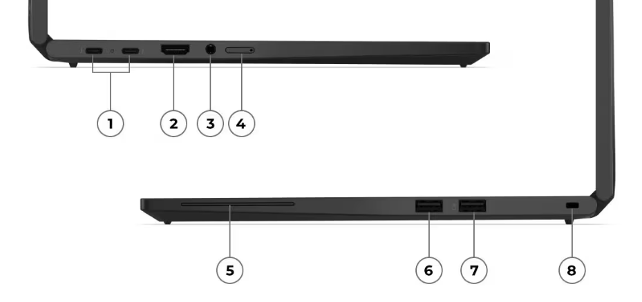 ThinkPad T14s 2-in-1 Gen1は、ビジネス用途に必要な端子をしっかり装備。Thunderbolt 4による高速転送や映像出力に対応しつつ、従来のUSB-Aポートも確保しています。