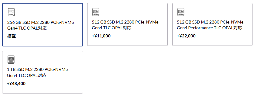 結論から言うと、この機種は一般的で安価な「Type 2280」という規格を採用しているため、「256GBを買って後で必要に応じて自分で交換する」のが最もお得です。 自分で交換したくない方は、「512GB」を選べば十分です。