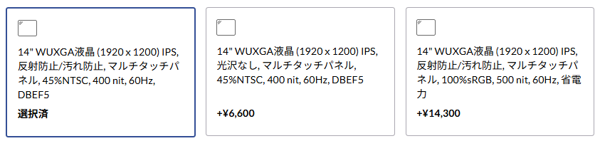 結論から言うと、「+¥14,300の省電力・高色域パネル」(一番右)が圧倒的におすすめです。画面の綺麗さが段違いで、さらにバッテリー持ちも良くなるため、価格以上の価値があります。