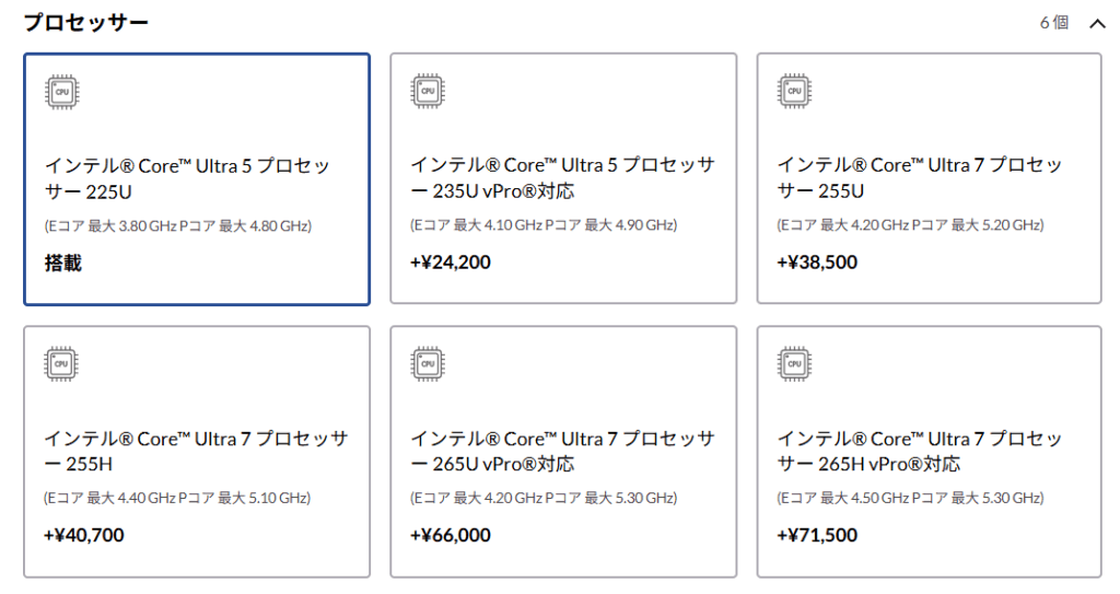 | CPU | 第2世代 Intel® Core™ Ultra プロセッサー(Lunar Lake)・Ultra 7 vPro® Enterprise 265H / 265U・Ultra 7 255H / 255U・Ultra 5 vPro® Enterprise 235U・Ultra 5 225U |