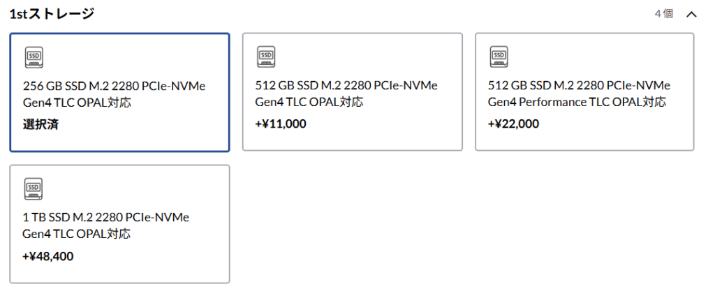 | ストレージ | SSD 256GB / 512GB / 1TB(PCIe) |
