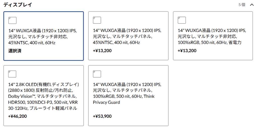 | ディスプレイ | – 14型 WUXGA(1920×1200) – IPS2.8K OLED(2880×1800) |