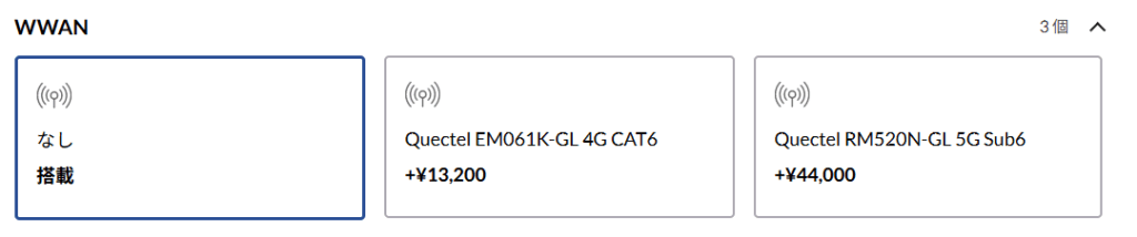 標準ではWWAN非搭載ですが、以下の2種類の通信モジュールを選択できます。