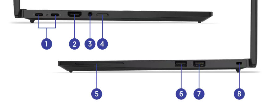 ThinkPad T14s Gen6 IALは、薄型ボディながら最新規格のThunderbolt™ 4ポートを2基搭載。映像出力・データ転送・充電を1本で行えるほか、HDMI 2.1やUSB-Aも備え、旧世代機器との互換性も万全です。ドックを利用すれば複数画面の出力も容易に行えます。ただし、有線LAN(RJ-45)ポートは非搭載のため、必要な方はドックやハブの準備が必要です。