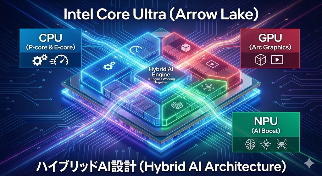 Arrow Lakeは、CPU(P-core/E-core)・GPU(Intel® Arc™ Graphics)・NPU(Intel® AI Boost)の3つの演算エンジンを統合。用途に応じて処理を自動で最適化し、AIアシスタントや画像認識などのローカルAI処理も軽快にこなします。これにより、作業の応答性を高めながら消費電力を抑えることが可能になりました。