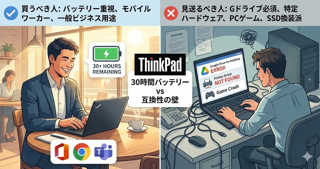 ThinkPad T14s Gen6 Snapdragonは、「バッテリー持ち」を最優先するモバイルワーカーにとって、現在考えうる最高の選択肢です。