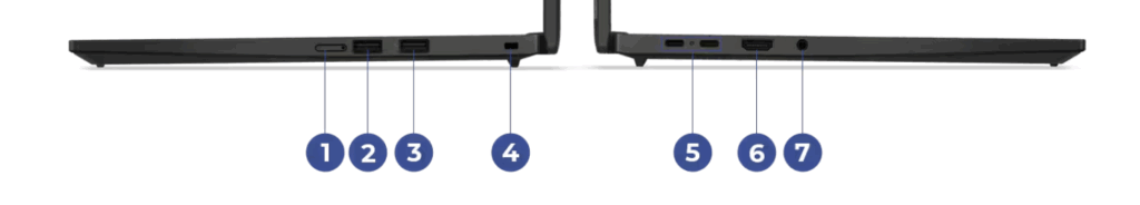 本体の左右に、USB4・USB 3.2・HDMIなど、ビジネス利用に必要な端子をバランス良く搭載しています。薄型1.24kgのモバイルPCでありながら、外部ディスプレイ出力や高速データ転送にも十分対応できます。