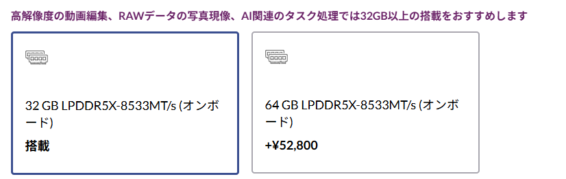 画像編集・FHD動画編集・大規模なExcelファイルを扱う場合、さらに余裕が欲しいなら64GBを選ぶとストレスなく動作します。一方で、Web・Teams・Officeが中心の軽めの業務なら16GBでも十分。将来的に増設できない“オンボードメモリ”のため、迷う場合は1ランク上を選ぶのが安心です。