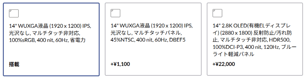 | ディスプレイ | – 14.0型 2.8K OLED(2880×1800) – 14.0型 WUXGA IPS(1920×1200) – 14.0型 WUXGA IPS(1920×1200)、マルチタッチ対応(10点) |