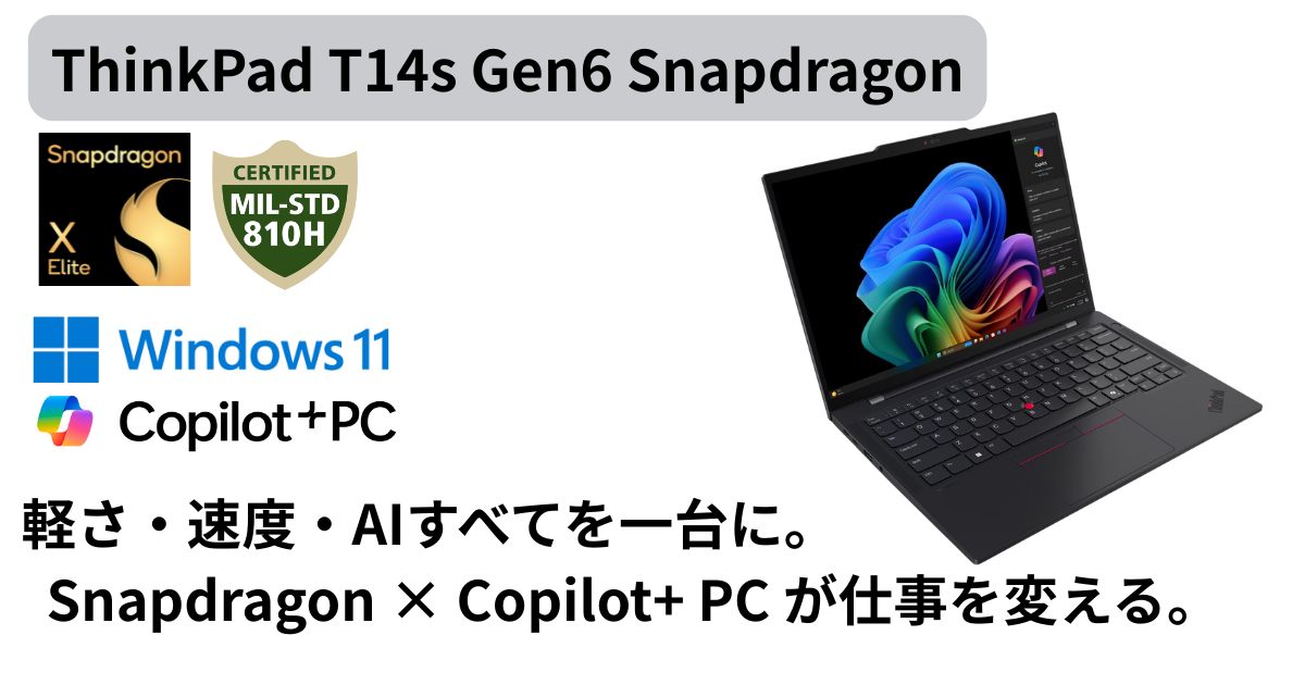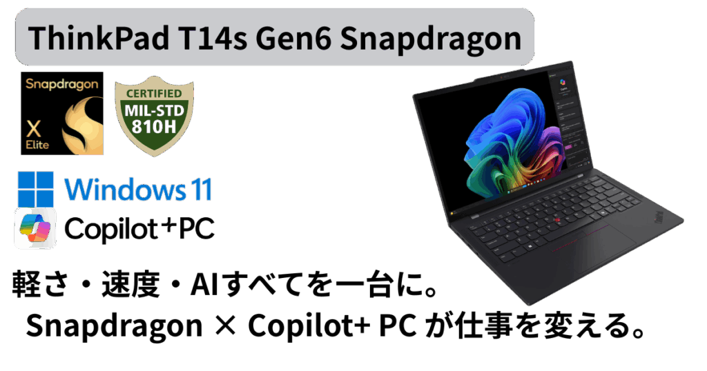 ThinkPad T14s Gen6 Snapdragon は、Qualcomm Snapdragon X Elite/X Plus を搭載した ThinkPad初のCopilot+ PC として登場した “次世代モバイルビジネスノート” です。
