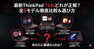 そこで本記事では、2020年の初代モデル(Gen 1)から2025年の最新機(Gen 6)まで、T14sシリーズの全系譜を完全網羅しました。 筐体デザインの刷新ポイント、画面比率の変更、そして今だからこそ狙い目な「中古市場の賢い選び方」まで。 T14sの購入を検討しているすべてのユーザーに贈る、完全保存版ガイドです。