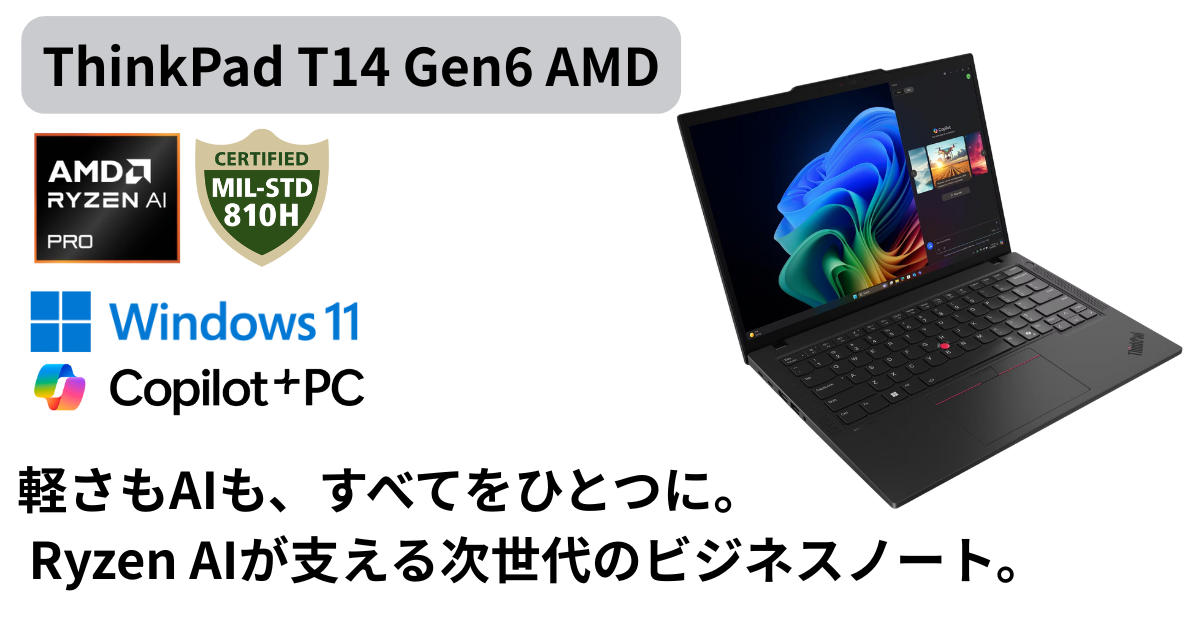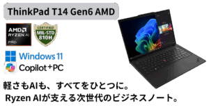 ThinkPad T14 Gen6 AMD は、AMD Ryzen™ AI PRO 300シリーズ(Ryzen AI 7 PRO 350/Ryzen AI 5 PRO 340) を搭載。