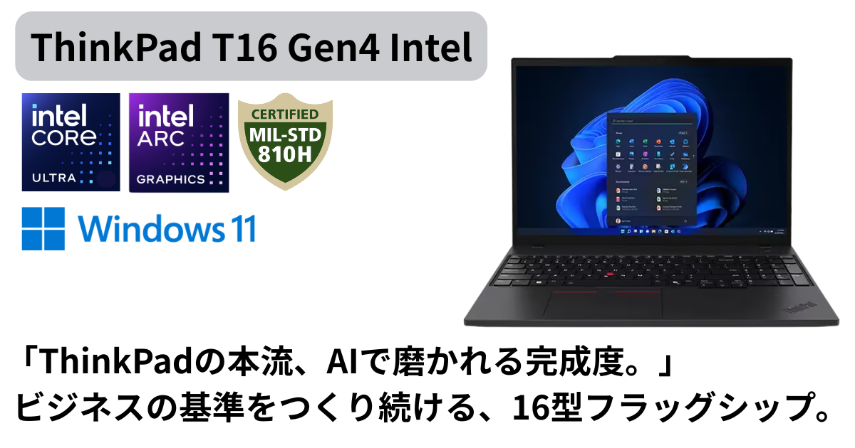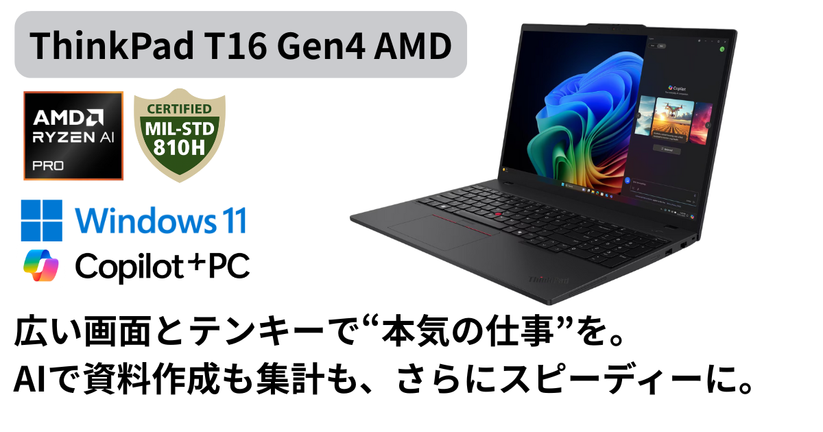 ThinkPad T16 Gen4 AMD は、Ryzen™ AI PROを搭載したCopilot+対応の16型ビジネスノートです。
