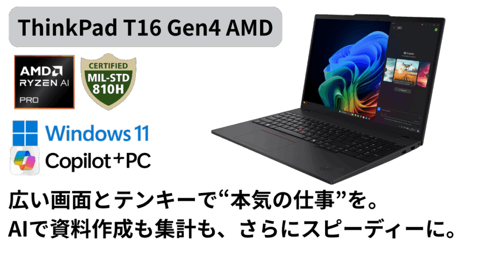 ThinkPad T16 Gen4 AMD は、16型の大画面・テンキー付きキーボード・Ryzen™ AI PRO搭載という
