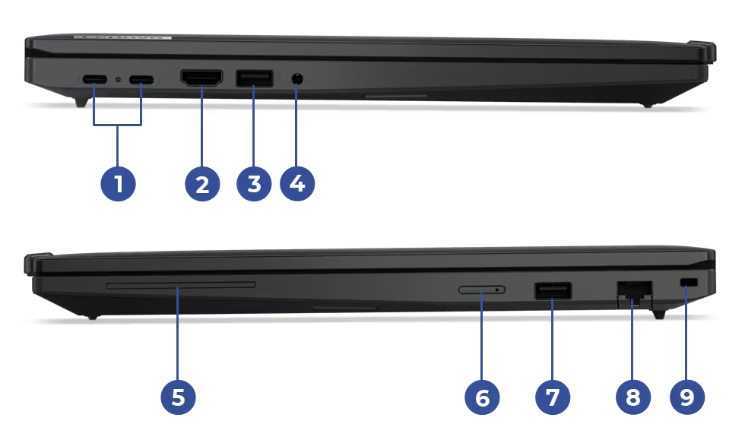 ThinkPad T16 Gen4 (AMD) は、最新の USB4/Wi-Fi 7 に対応し、拡張性と安定性を両立。HDMI、RJ-45 などの有線ポートも備え、オフィスでも出張先でも安心して使える構成です。以下は左右側面の端子一覧です。