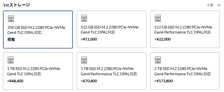 | 256GB | Gen4 TLC(OPAL対応) | 軽量な書類作成・メール中心のビジネス利用に十分。最小構成でコスト重視のユーザー向け。 |
