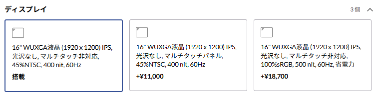 | ① 標準 WUXGA IPS(非タッチ) | 1920×1200/光沢なし | 400nit | 45% NTSC | 非対応 | 標準構成。文書作成やブラウジング中心のユーザーに最適。コスパ重視派におすすめ。 |