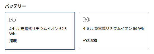| 標準バッテリー(52.5Wh) | 52.5Wh | 約10~15時間 | 標準構成。軽さを優先したいユーザー向け。出張や持ち運びが多い方に最適。 |