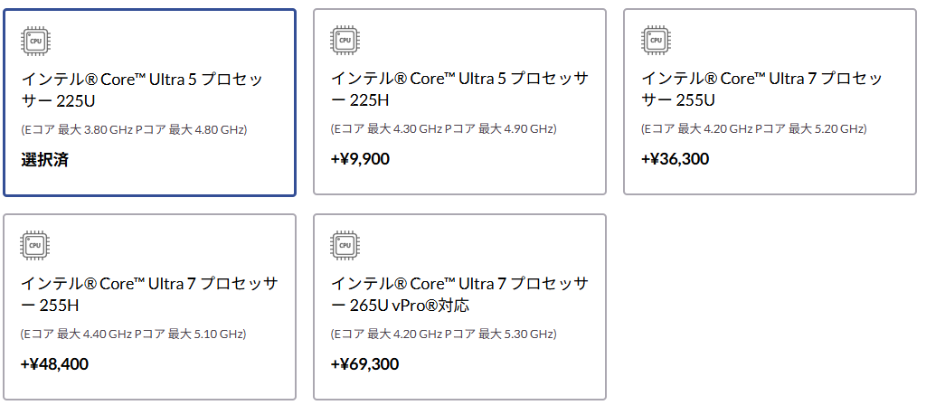 | CPU | – Intel® Core™ Ultra 7 vPro® Enterprise プロセッサー 265H/265U – Intel® Core™ Ultra 7 プロセッサー 255H/255U – Intel® Core™ Ultra 5 vPro® Enterprise プロセッサー 235H/235U – Intel® Core™ Ultra 5 プロセッサー 225H/225U |