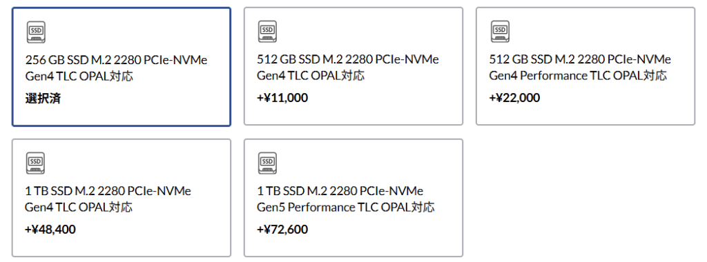 | 256GB (Gen4) | TLC OPAL対応 | 書類作成・ウェブ中心の軽作業向け。ストレージをクラウド運用する人に最適。 |