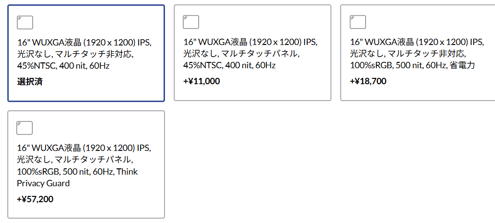 | 16型 WUXGA IPS(非タッチ/標準) | 400nit | 45%NTSC | 標準的なビジネス用途に最適。コスパ重視で屋内中心の作業に。 |