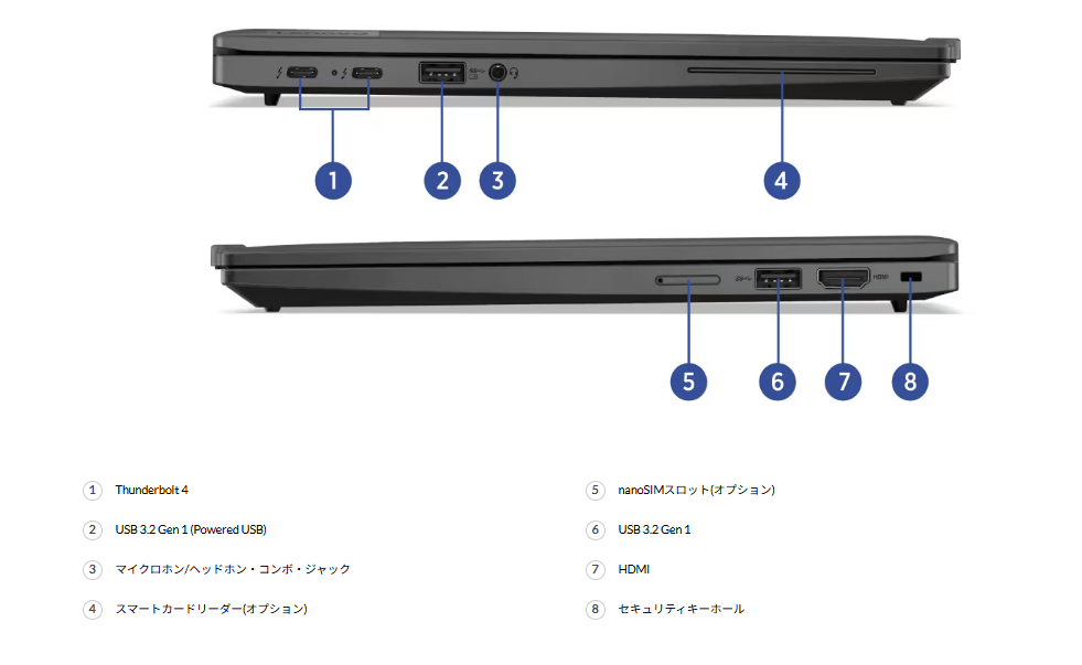 また、HDMIポートを標準装備しているため、会議室のモニターやプロジェクター接続もスムーズ。nanoSIMスロット(オプション)を選べば、5Gモバイル通信も可能です。セキュリティキーホールやスマートカードリーダー(構成による)など、法人利用を想定した設計も魅力です。