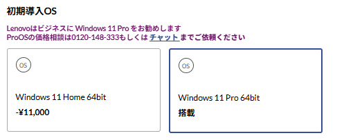 標準は Windows 11 Pro 64bit(日本語版)。個人用途向けの Windows 11 Home 64bit に変更すると −¥11,000 となります。